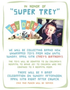 In celebration of Trey’s birthday, we want to do something special in honor of our son. All the details are on the picture below, but for those who want to participate, please bring new “unwrapped” toys to FBC Newcastle between now and Sunday, April 13th (Trey’s physical birthday). You can also bring an unwrapped present with you to church on 13th if you would like.
